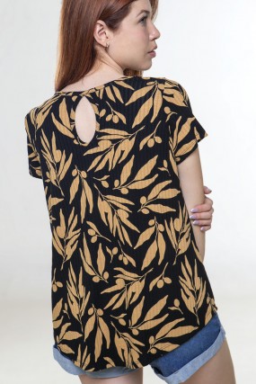 Remera con abertura en forma de gota en la espalda confeccionada en morley viscosa estampada.