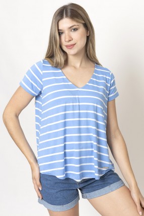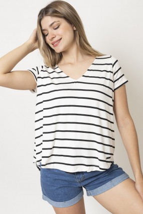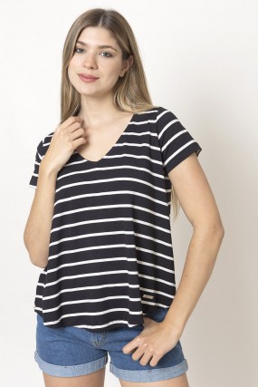 Remera rayada con escote en V y abertura en forma de gota en espalda confeccionada en viscosa