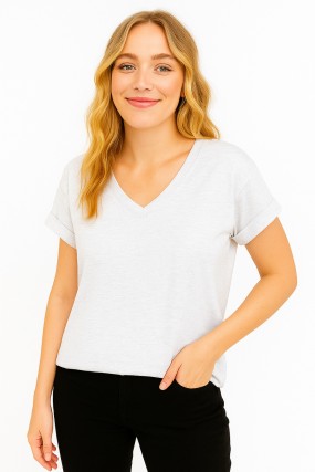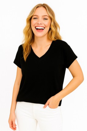 Remera con escote en V con manga dolman confeccionada en modal viscosa.